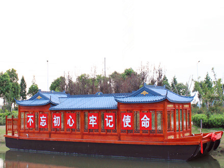 畫舫船就是裝飾古典華麗的游船,是"中國風(fēng)"的仿古游船,結(jié)合古典園林建筑,體現(xiàn)了中華文明的古典藝術(shù).畫舫船豪華而又古典,船上的建筑按照中國古代建筑里的亭臺(tái)樓閣,建筑工藝之復(fù)雜,要求之嚴(yán)格,仿古畫舫游船的特點(diǎn)飛檐翹角、玲瓏精致的四角亭子逐漸成形,赫然立于船頭,美人靠、盤龍柱子、彩畫……龍柱上的浮雕盤龍和祥云一層扣著一層,層層錯(cuò)落有致,雕刻精細(xì)到盤龍身上的每一個(gè)鱗片都細(xì)細(xì)可數(shù),古代皇家標(biāo)志性元素,在畫舫船上體現(xiàn)的淋漓盡致。除了雕刻、花窗,整條船還有一個(gè)看點(diǎn),那就是弧線優(yōu)美、高高翹起的船尾。游船并不大,長約10米、寬3米,但是整體看起來堪稱一件藝術(shù)品。船尾的雕花欄桿與船艙、船頭的雕刻遙相呼應(yīng),船身四周貼著浮雕祥云,給整條船增添了富貴、華麗的氣質(zhì)。